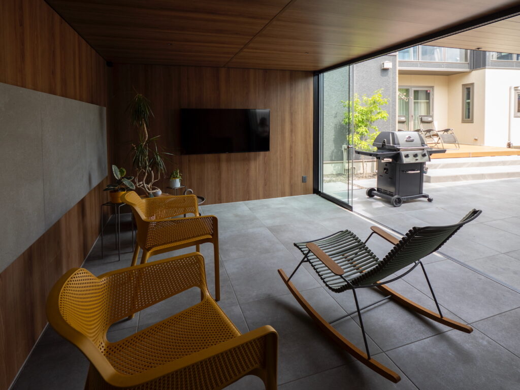 ガラス引き戸付きルームは、外の開放感と室内の快適さを両立する“半屋外のラウンジ空間”。