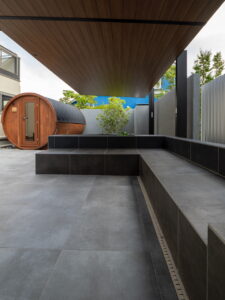 足元にはタイルを組み合わせ、サウナ利用時の動線を快適に整備。