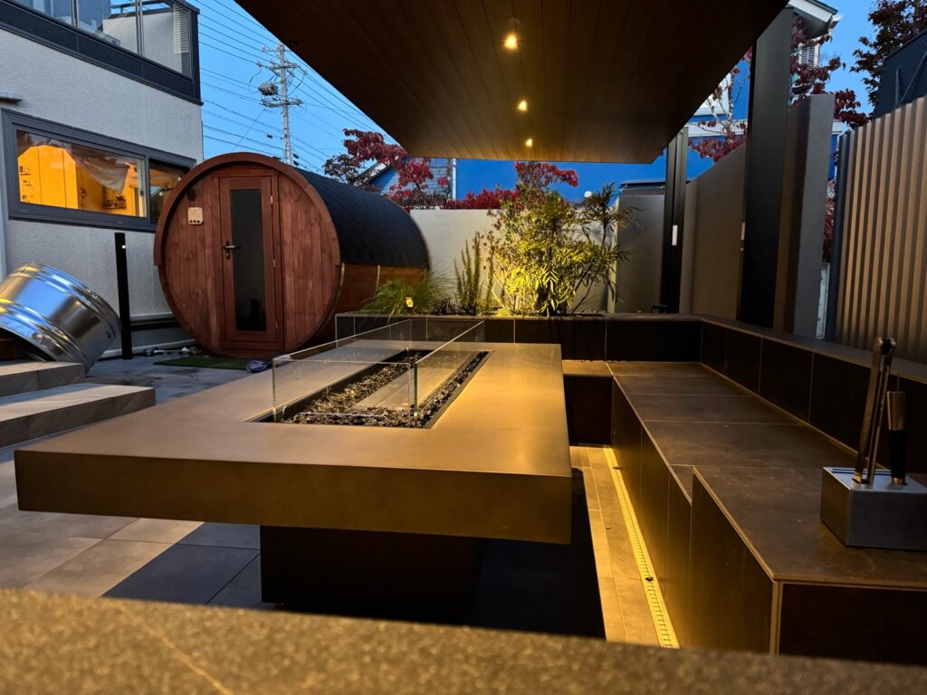 “炎を囲む贅沢な外気浴スペース”をデザインしました。