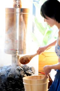 樽型の美しいフォルムと、天然木材の香りに包まれる癒しの空間は、まるで森の中の隠れ家のよう。